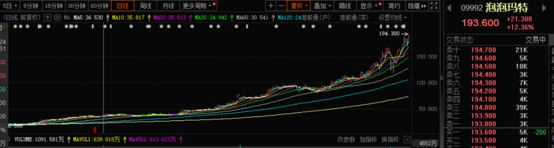 股价上涨近十倍的超级大牛股泡泡玛特今天早上股价再度狂飙近12%,刷新历史新高。港股和A股的谷子经济概念股亦集体拉升。